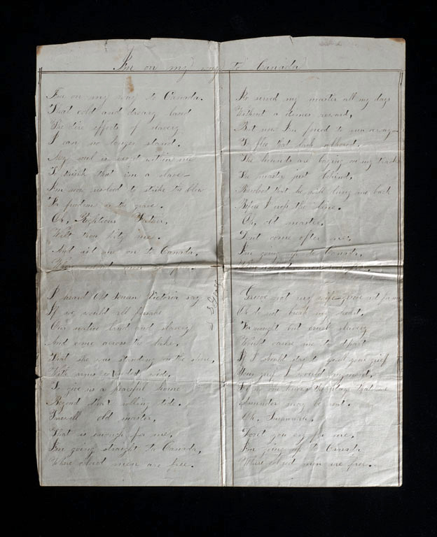 Handwritten lyrics to the song “I’m on my way to Canada,” ©Canadian Museum of History, 2014-H0013, photo Steven Darby, IMG2014-0080-0001-Dm