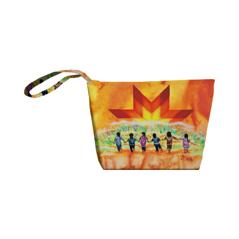 These fully lined totes feature durable canvas handles and secure zipper closures. Use it to store your small items at home or on the go. Each bag showcases genuine indigenous artwork, with royalties paid by our supplier to the artist or copyright holder for every sale. This bag features the Always in Our Hearts artwork by Cree-Ojibway artist Shawna Boulette Grapentine.
