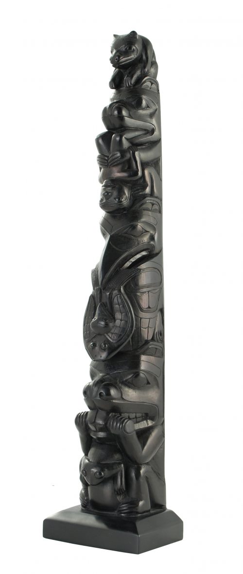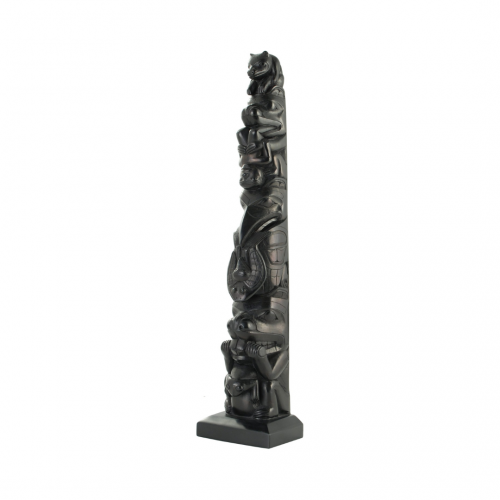 | This complex pole depicts Bear Mother and her cub, Raven stealing Halibut, and Beaver with Frog. These reproduction pieces in high density resin are moulded from casts of original historical Haida carvings in argillite from the Canadian Museum of History’s collection. Argillite is a soft slate-like material found only on Haida Gwaii. Haida artists have carved this important material for trade and for sale since at least the early nineteenth century. 39 cm. |