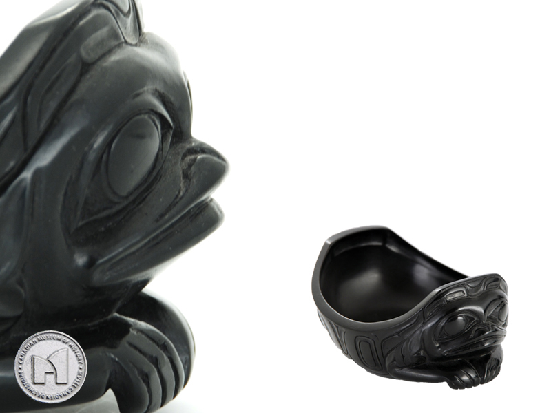 | This bowl represents Frog and is a reproduction of a Haida bowl originally carved in wood. These reproduction pieces in high density resin are moulded from casts of original historical Haida carvings in argillite and wood from the Canadian Museum of History’s collection. Argillite is a soft slate-like material found only on Haida Gwaii. Haida artists have carved this important material for trade and for sale since at least the early nineteenth century. 13.75 x 10 cm. |
