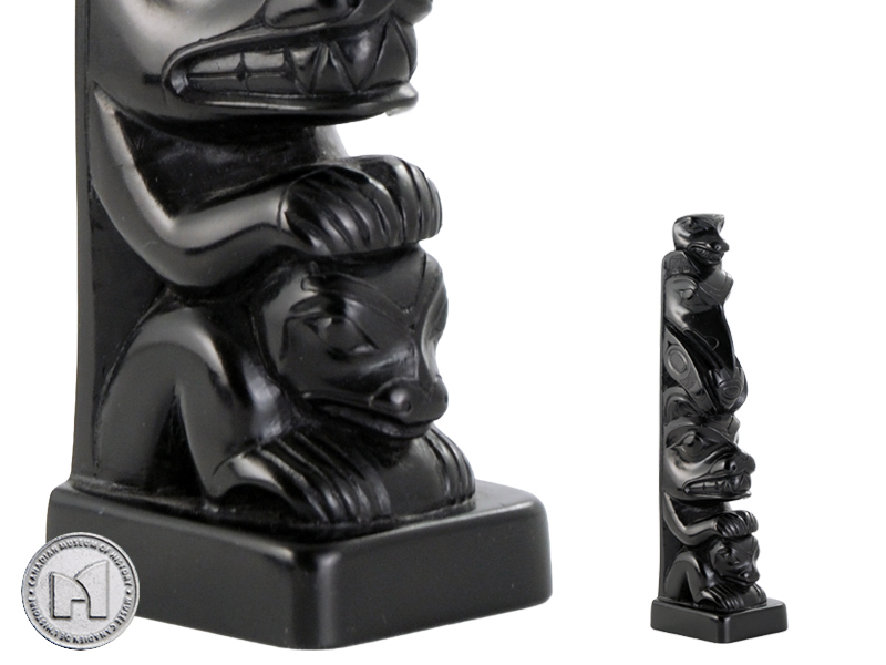 | This pole depicts Raven, Bear Mother, and her Cubs. These reproduction pieces in high density resin are moulded from casts of original historical Haida carvings in argillite from the Canadian Museum of History’s collections. Argillite is a soft slate-like material found only on Haida Gwaii. Haida artists have carved this important material for trade and for sale since at least the early nineteenth century. 18.5 cm. |