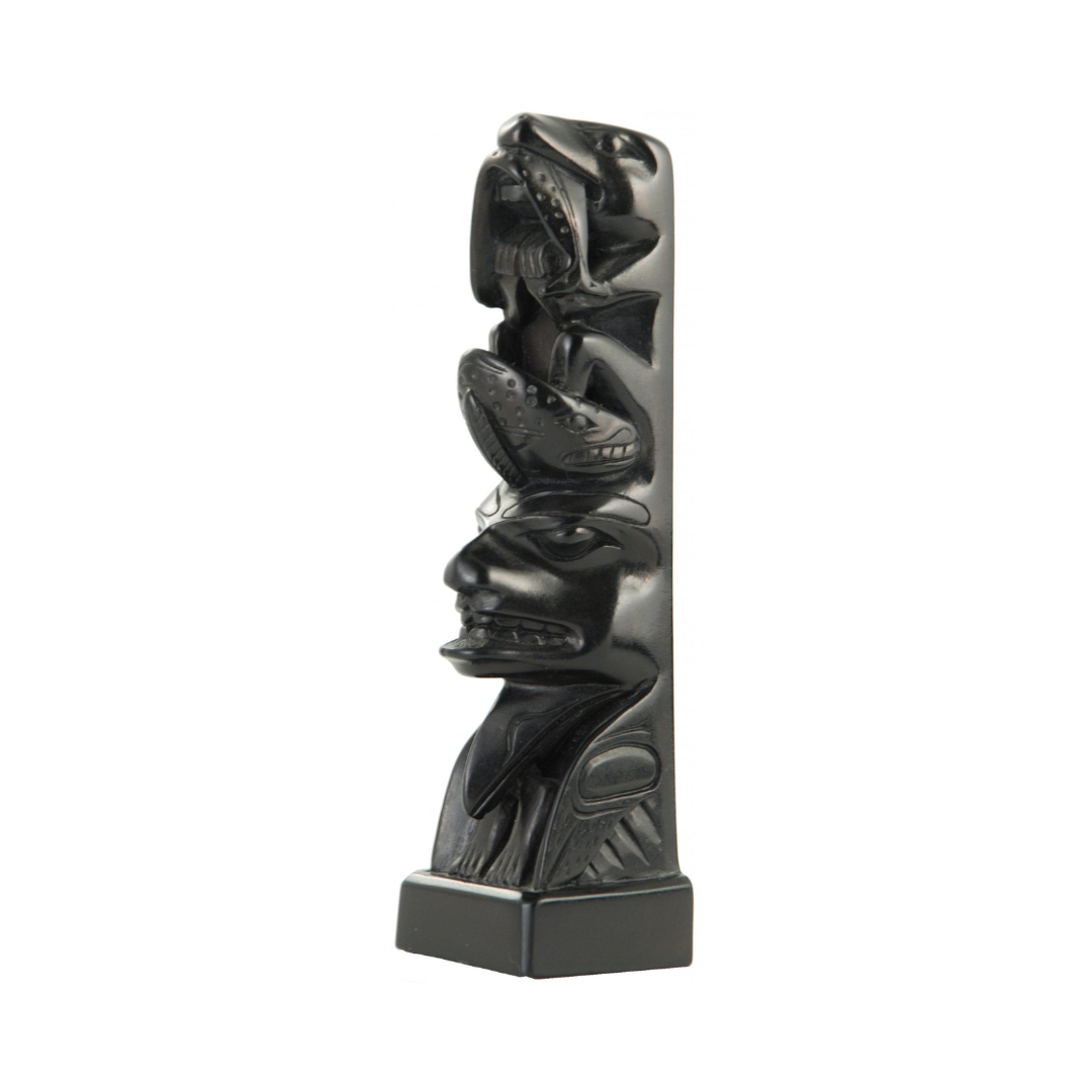 | This pole depicts Wasco with two Whales, beneath which is the Raven, disguised as a Woman with a labret, from the story of Raven’s adventure with the Halibut fisherman. These reproduction pieces in high density resin are moulded from casts of original historical Haida carvings in argillite from the Canadian Museum of History’s collection. Argillite is a soft slate-like material found only on Haida Gwaii. Haida artists have carved this important material for trade and for sale since at least the early nineteenth century. 13.5 cm. |