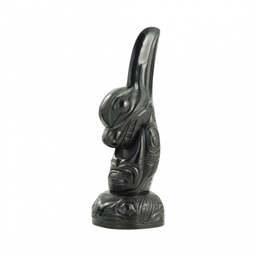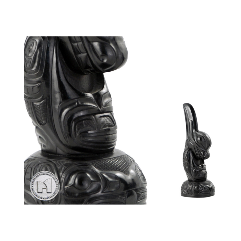 | This sculpture represents Raven transforming into Killer Whale, by contemporary Haida artist Ed Russ (1953-2006). These reproduction pieces in high density resin are moulded from casts of original Haida carvings in argillite from the Canadian Museum of History’s collection. Argillite is a soft slate-like material found only on Haida Gwaii. Haida artists have carved this important material for trade and for sale since at least the early nineteenth century. 17.5 cm. |