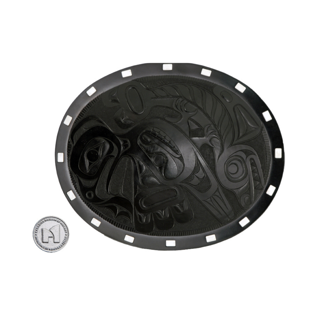 | This platter depicts Thunderbird and Whale. These reproduction pieces in high density resin are moulded from casts of original historical Haida carvings in argillite from the Canadian Museum of History’s collection. Argillite is a soft slate-like material found only on Haida Gwaii. Haida artists have carved this important material for trade and for sale since at least the early nineteenth century. 23 x 19 cm. |