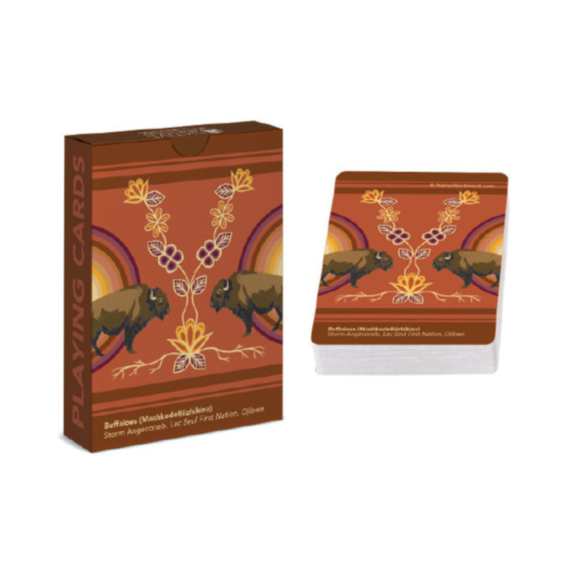 These playing cards are ideal for your game nights! With beautiful Indigenous artwork crafted by talented artists, these cards guarantee endless fun. Each deck comes neatly packed in a paper box and tin box, showcasing the remarkable Buffaloes (MashkodeBiizhikina) artwork by Storm Angeconeb, representing the Lac Seul First Nation and Ojibwe nations.