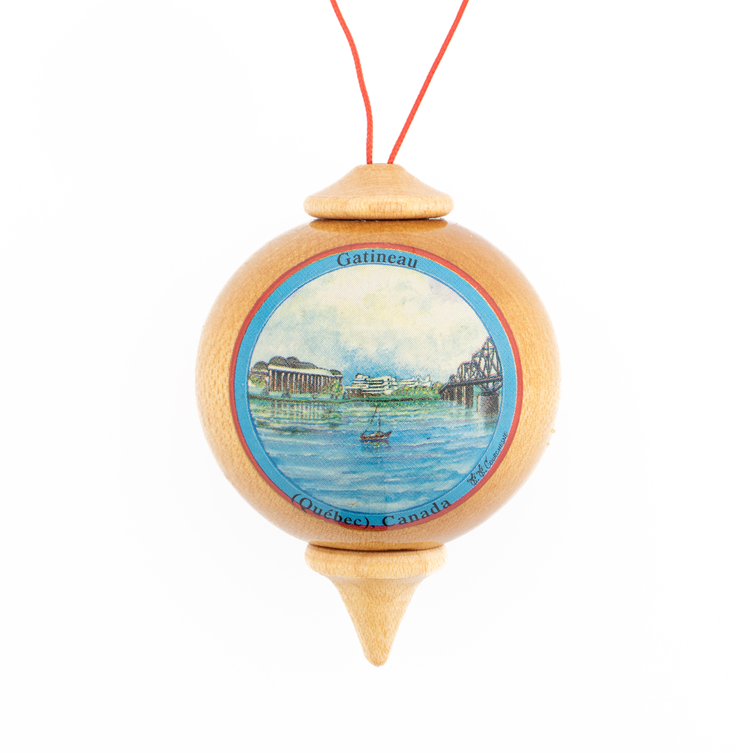 Handmade in Canada, this wooden ornament makes a perfect souvenir or gift from the Canadian Museum of History. It showcases a beautiful view of the museum from the Ottawa River on the front, with the museum’s logo on the back.