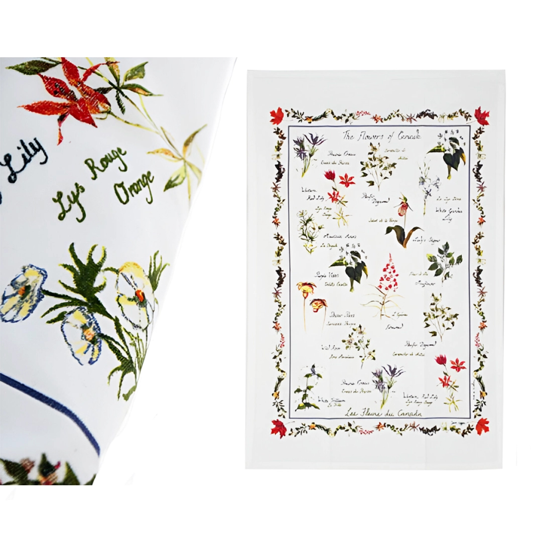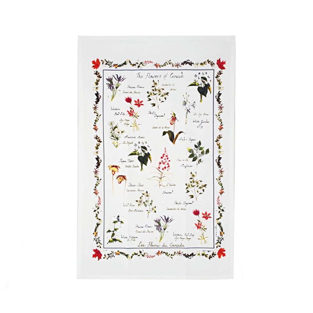 This elegant bilingual tea towel features a vibrant array of Canadian wildflower species, celebrating the natural beauty of our country’s flora.