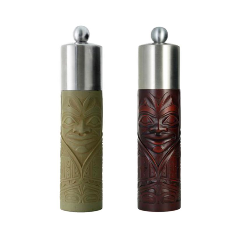 These exquisite and unique salt and pepper grinders were carved by west coast artist Mark Garfield. The recycled glass sleeves feature beautifully carved Haida Chief in ceremonial wear complete with chilkat blankets.