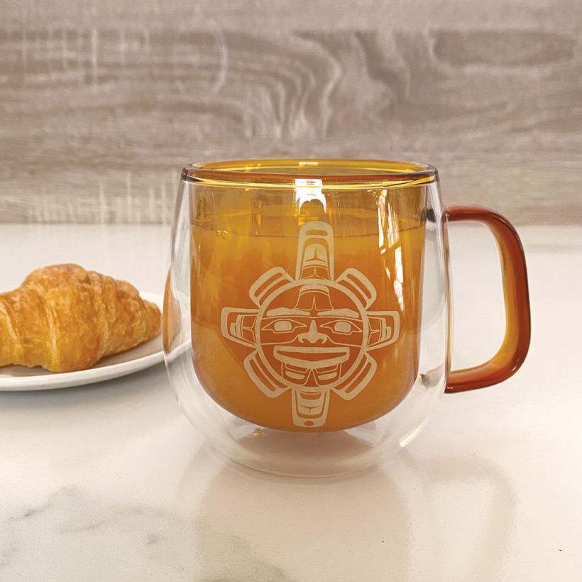This stunning glass mug features the “Chilkat Sun” design by Nahaan, a talented Tlingit artist. The vibrant inner colored glass creates a visually captivating experience. Both microwave and dishwasher safe, this mug comes elegantly packaged in a gift box. Made from durable high-end borosilicate glass, it can handle boiling liquids with ease. Elevate your daily ritual with a mug that seamlessly blends tradition and modern design, offering both style and functionality with every sip.