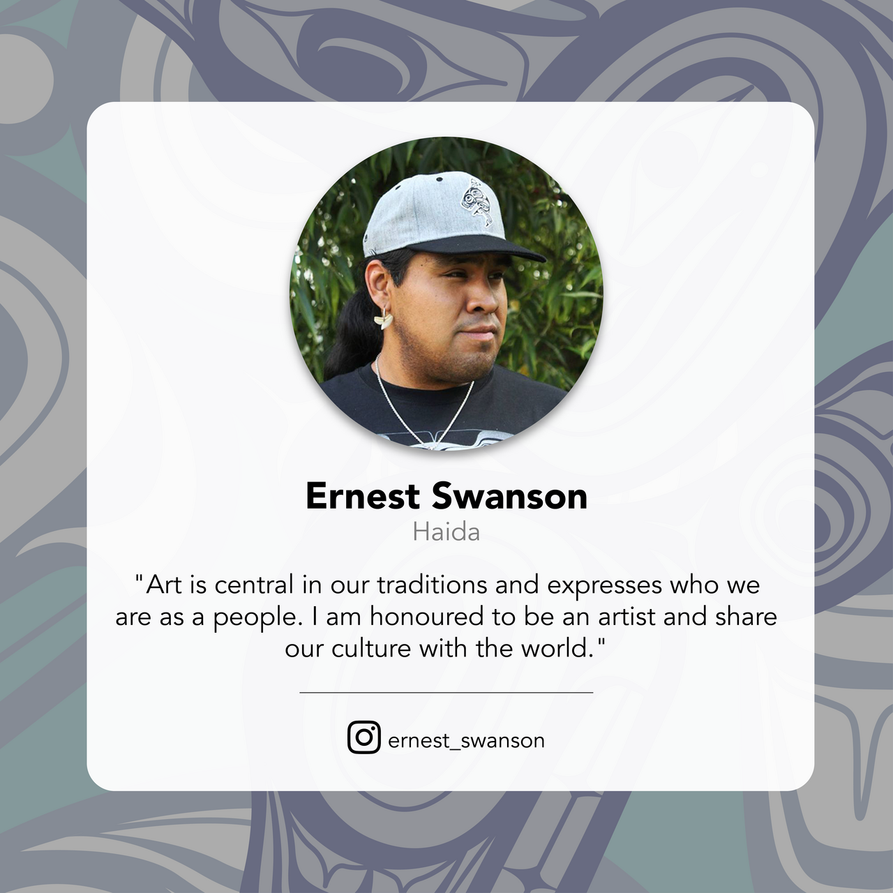 Ernest Swanson is a Haida artist from Old Massett, British Columbia, who currently lives in Vancouver. Ernest holds the traditional Haida name, Giinowaan, as a successor to the Yaghulaanas Raven Clan of Dadens. As a matrilineal descendant of iconic Haida artists, including Charles Edenshaw, and grandson to the late Rufus Moody, Ernest continues his family’s legacy by creating traditional Haida art. In 2004, he began to work with artists such as Jim McGuire, Christian White and Chief Edenso James Hart. In 2005, he won the Emerging Artist award from British Columbia’s Alliance of Arts and Culture. Ernest has continued to display his works regionally, nationally and internationally, working in wood, silver, gold and argillite. Ernest has also been elected into the Council of the Haida Nation as a Vancouver regional representative.