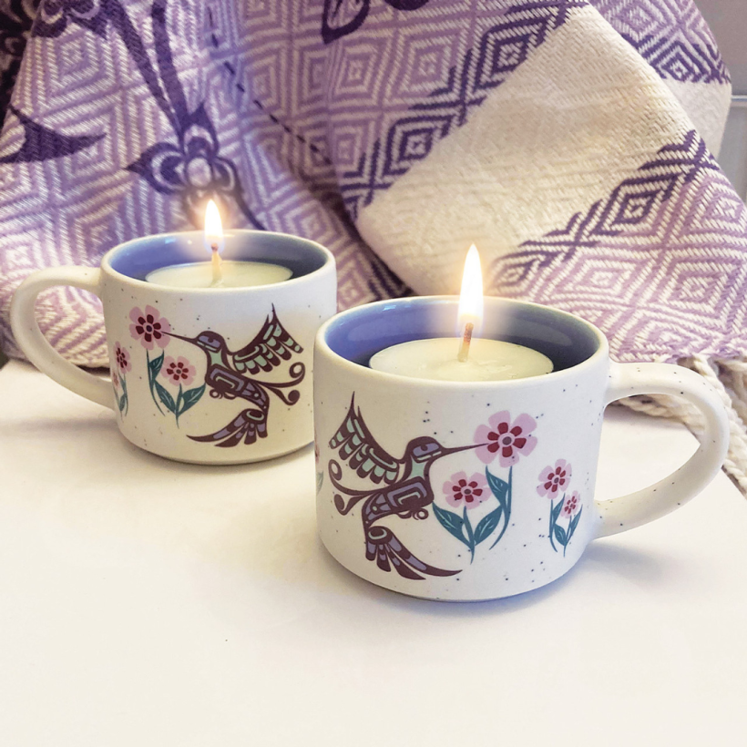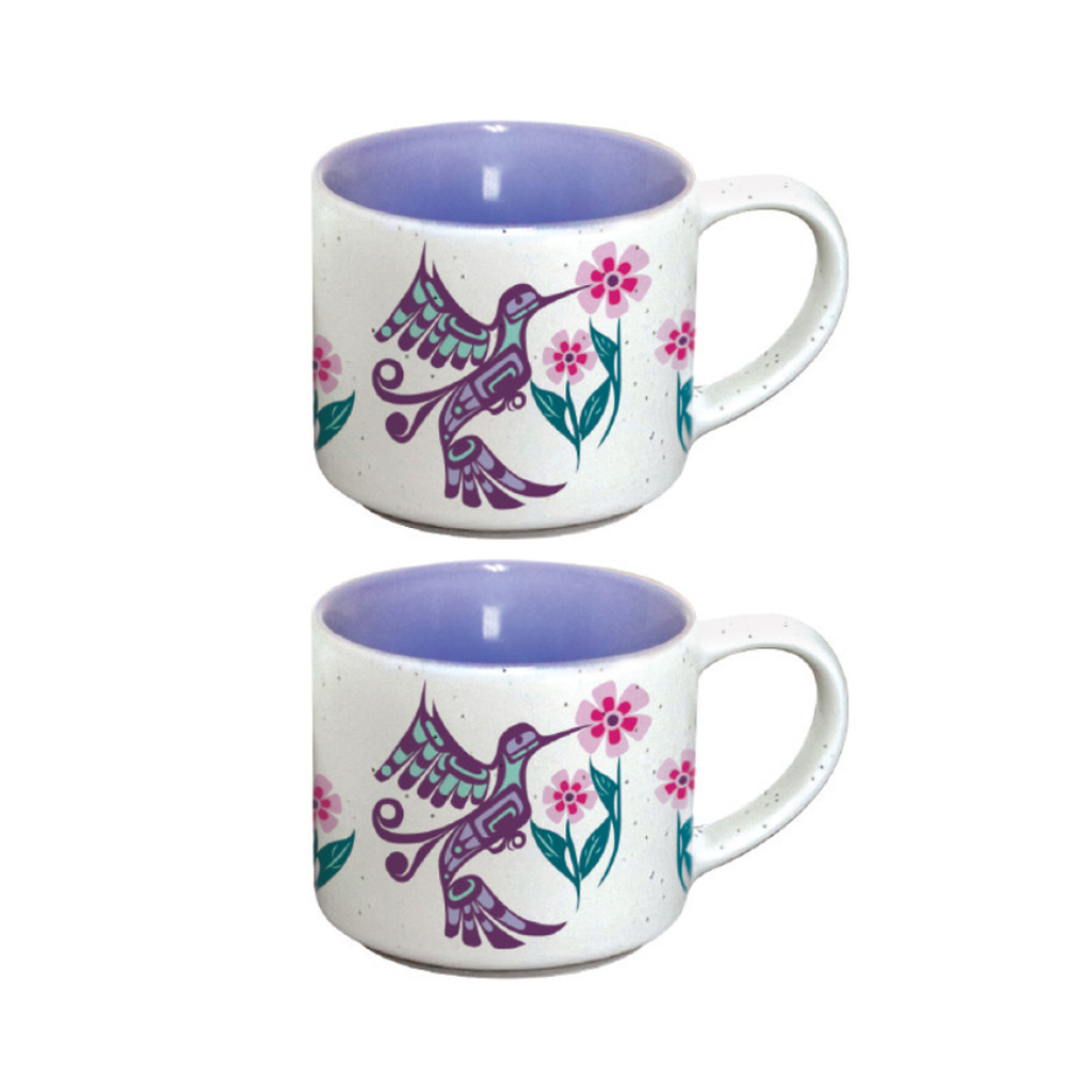 Brighten your morning routine with these stunning 3 oz (90 ml) ceramic espresso mugs featuring the Hummingbird artwork by indigenous artist Francis Dick. With a chic speckled matte exterior and a vibrant colored glossy interior, these mugs offer an improved coffee experience. Stackable and versatile, they can also serve as tea light holders, cream and sugar containers, or condiment cups. Packaged in sets of two in a colorful gift box, they make the perfect gift for any occasion.