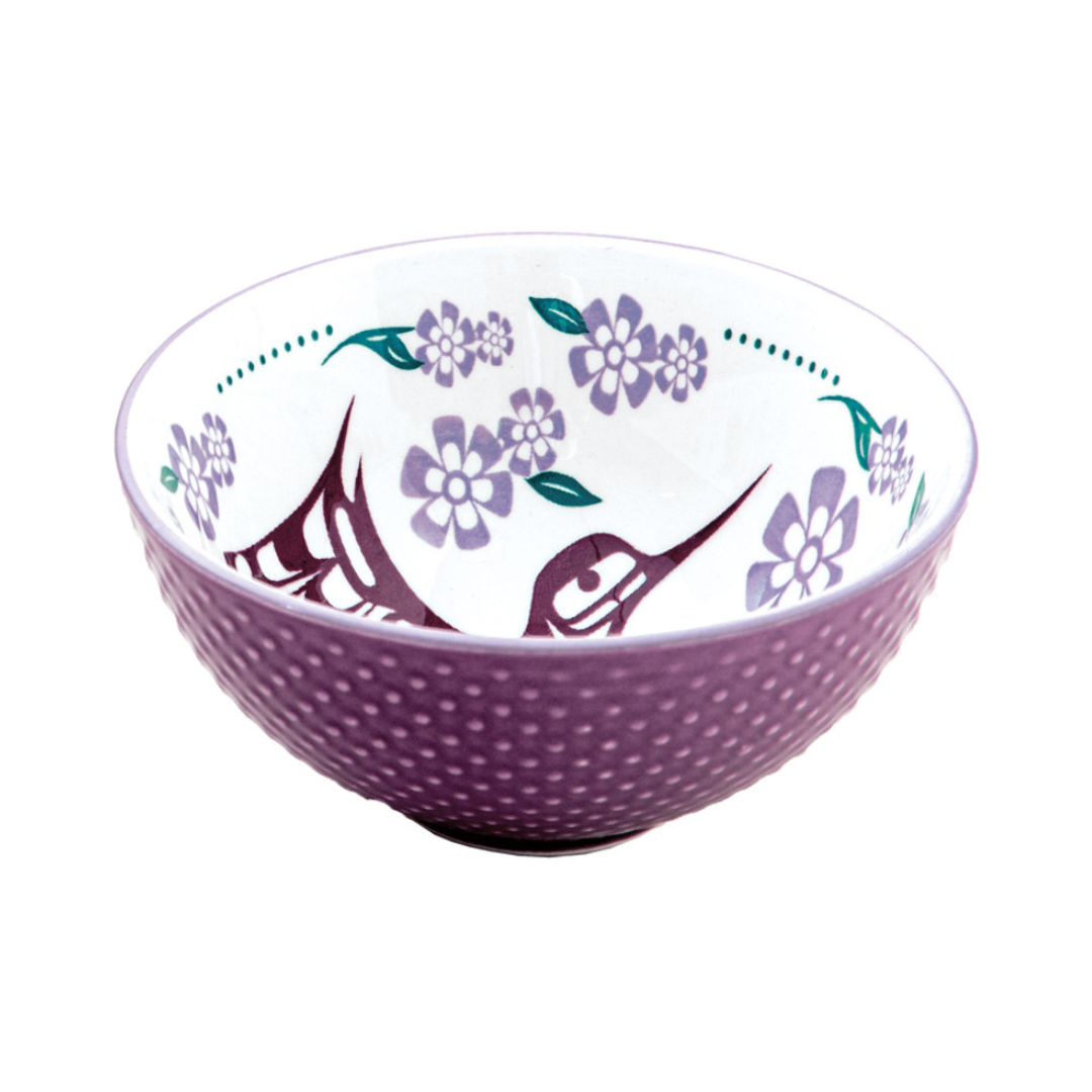 This porcelain art bowl has a contemporary Indigenous design and textured exterior and is both beautiful and functional. The exterior is a rich dark purple hue, while the interior features the purple Hummingbird design by Francis Dick.
