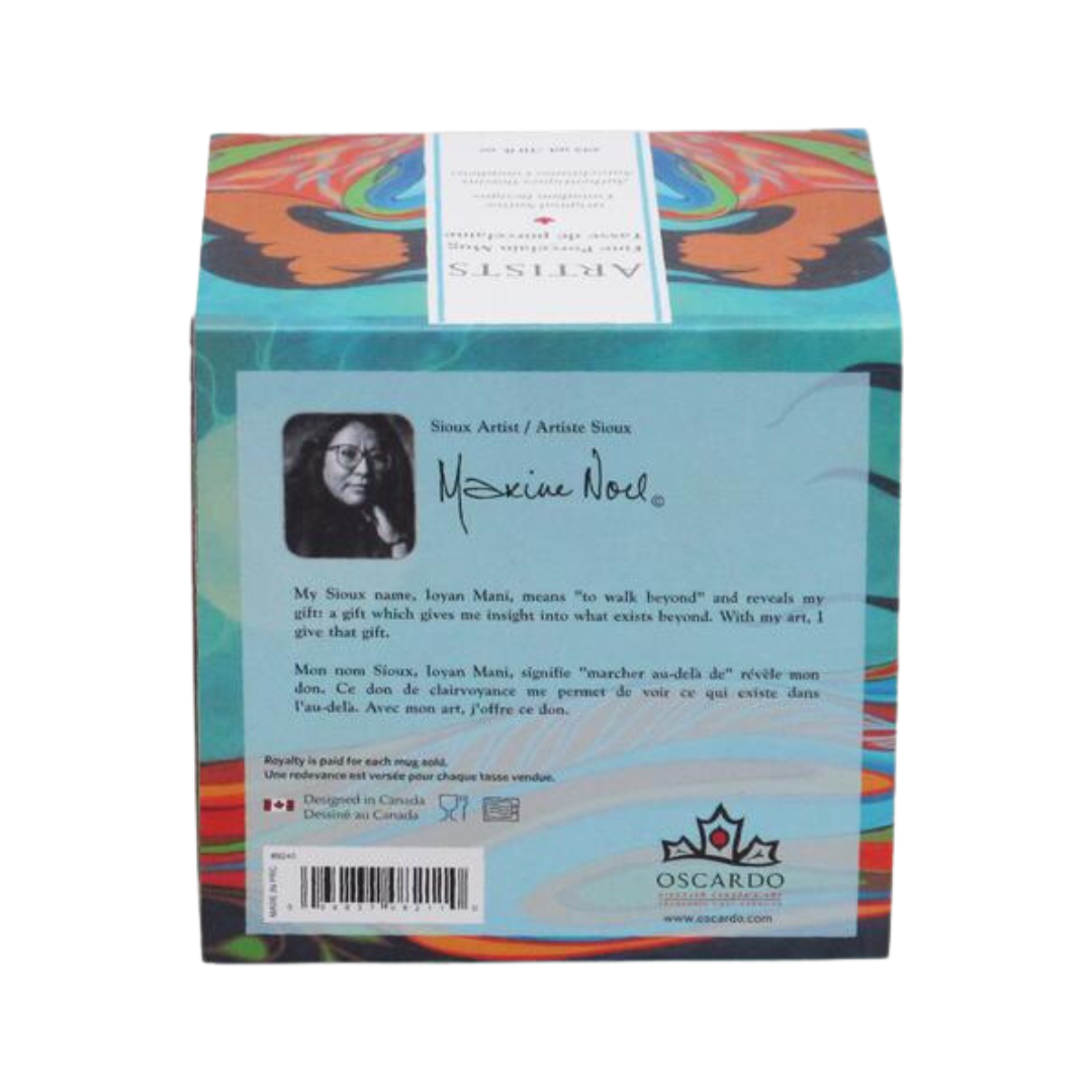 Maxine Noel is from Manitoba and her parents are Santee Oglala Sioux. She works with different media such as painting, drawing, serigraphy, etching and stone lithography. Maxine Noel signs her artwork with her Sioux name IOYAN MANI, which translates as “Walk Beyond”. This artwork is a celebration of Mother Earth, flourishing with clean waters and the warm rays of the sun.