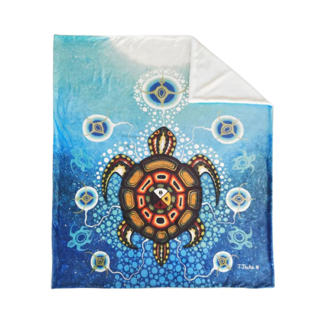 This faux rabbit fur throw blanket displays the Medicine Turtle design by James Jacko. Machine washable for effortless maintenance, it comes packaged in a clear zipper-closed bag for easy storage. Unrivaled warmth and softness meet modern luxury with this blanket.