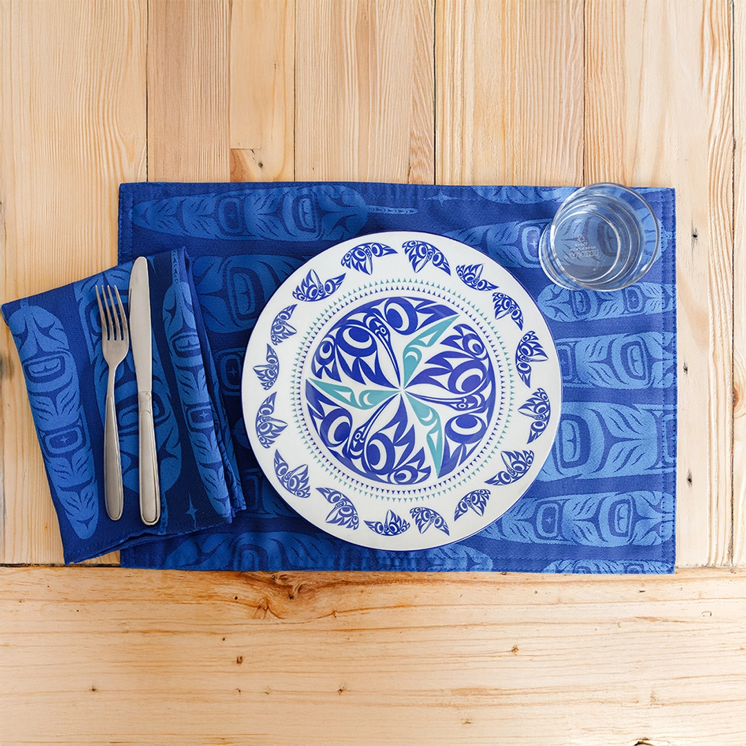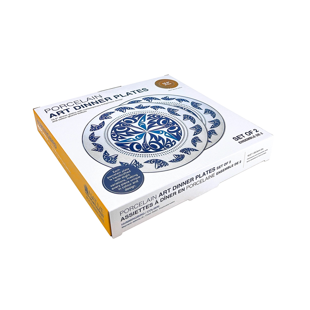 This set of 2 porcelain art dinner plates features Hummingbird artwork designed by Coast Salish, Kwakwaka’wakw artist Maynard Johnny Jr. These 10.5″ round plates add a unique cultural touch to your dining table and double as elegant decorative pieces. Each set is individually boxed, making them perfect for gifting or enhancing your dining experience.