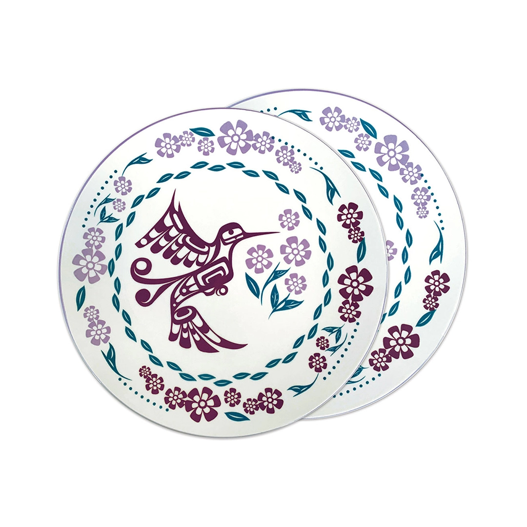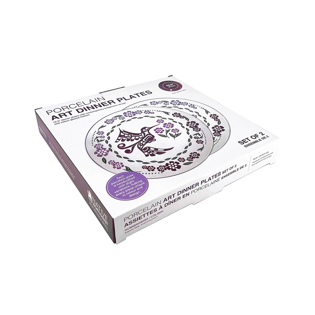 This set of 2 porcelain art dinner plates features Hummingbird artwork designed by Kwakwaka’wakw artist Francis Dick. These 10.5″ round plates add a unique cultural touch to your dining table and double as elegant decorative pieces. Each set is individually boxed, making them perfect for gifting or enhancing your dining experience.