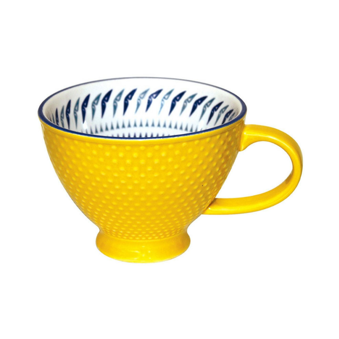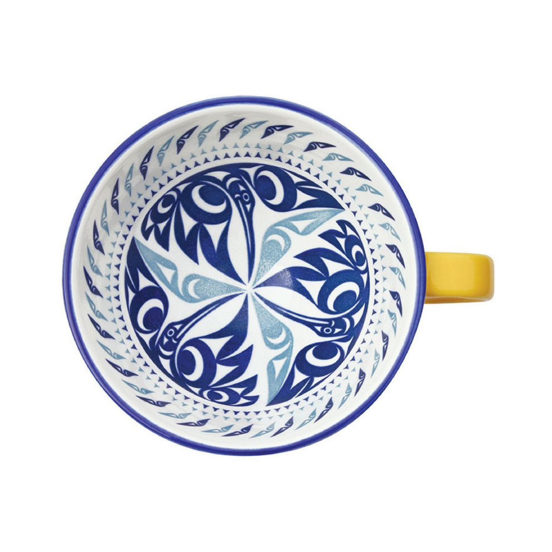 Contemporary Indigenous design mugs with textured exterior and printed design on interior.