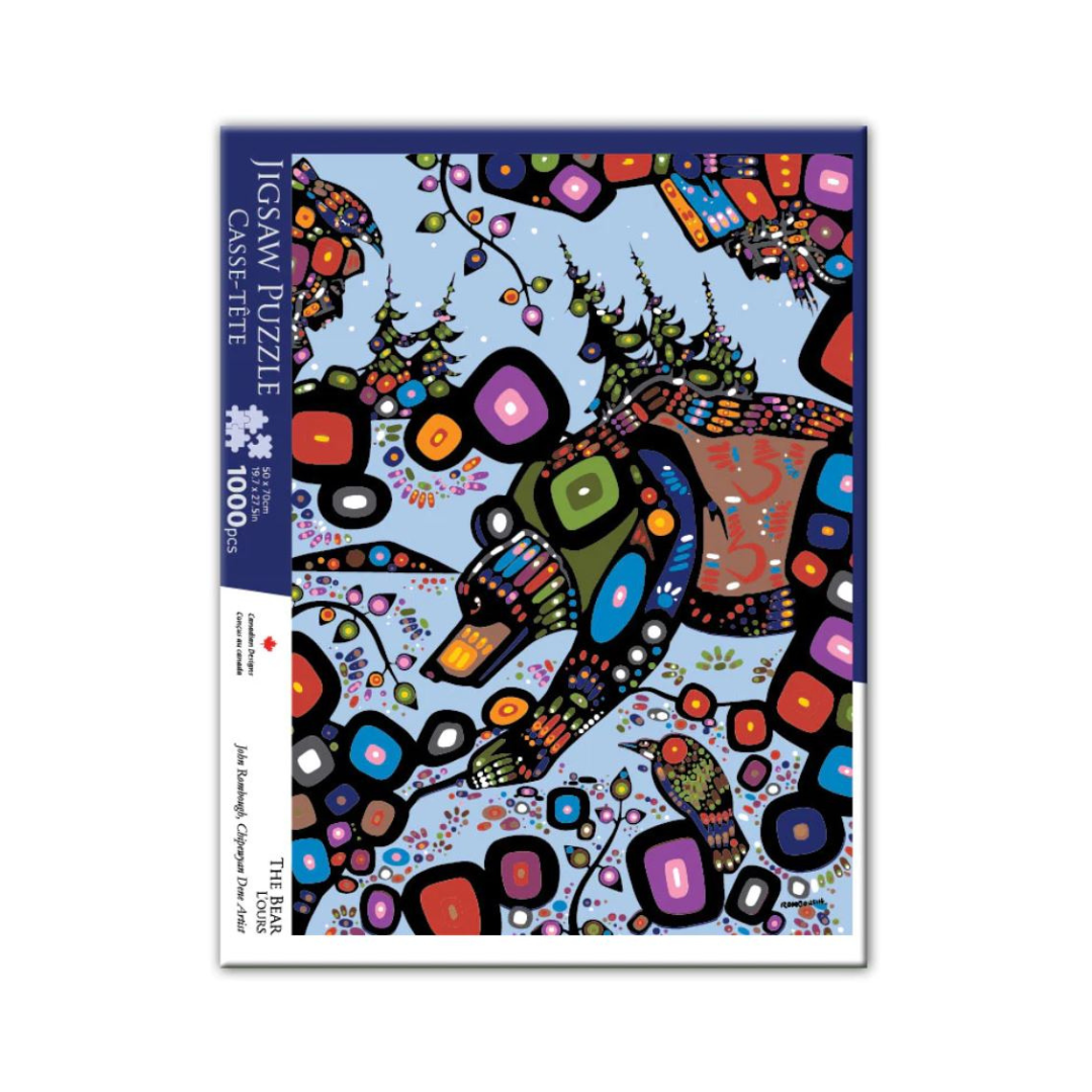 Designed by Chipewyan Artist John Rombough, this 1000 pieces puzzle is printed on high-quality and matte-laminated cardboard. “On an early spring morning, the bear in his elements is walking alongside grandfather rocks. As the Ancestors watch over the land, the Ravens welcome the bear from a long winter’s nap.” – John Rombough
