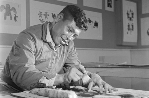 Iyola Kingwatsiak creating a stencil print photo Rosemary Gilliat Eaton, September 27, 1960,
