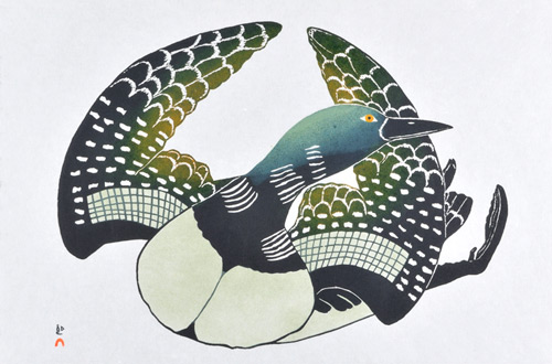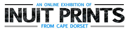 For over one thousand years, Inuit have lived off the Arctic’s rich natural bounty of marine mammals, fish, an array of land animals and birds. In earlier times, families lived on the land in snow igloos and skin tents, moving with the seasons to hunt seals, walrus, whales, caribou, geese, and musk-oxen. These animals provided nourishing food, skin for clothing, lamp oil and most of the raw materials from which tools, games and goods were made. Other animals, all uniquely adapted to live above the treeline, were vitally important to Inuit too: polar bears, foxes, wolves, hares, wolverine, ground squirrels, weasels, lemmings, fishes and clams. Unsurprisingly, animals are frequently depicted in Cape Dorset prints, and evoke the longstanding bond between Inuit and their natural world.