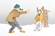 Steeped in memories, many prints document the history of the North, including the profound changes that came with the arrival of the Missionaries, traders and RCMP in the early twentieth century. Other historical prints show aspects of a traditional life—old games, ways of hunting and traveling on the land, traditional clothing—that was practiced long ago. Although many prints capture events from living memory, others show life as it was imagined to have been, or based upon stories told of yesteryear. Some memory prints describe individual histories and have personal meanings known largely to the artist. At times humorous, at times harrowing, they tell of the trials and tribulations of days gone by.