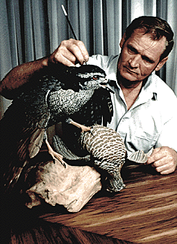 He carved his first wooden bird in his basement workshop from a reproduction of a poorly painted picture of a hawk. Later, he began to sketch birds in the field, study stuffed mounts and birdskins, and emulate the wildlife carvings of Bernie Smith, a talented local craftsman. With less than four years of carving experience, he was coaxed into submitting some of his own work to the international carving competition in Maryland. Hazzard left with fifteen ribbons in the novice class of wildlife carving. Since those early days, he has been awarded a roomful of trophies and plaques, and his carvings have travelled the globe as part of a prestigious world tour of nature art.