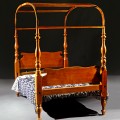 The canopy form, which is not commonly found in Canada, is derived from beds with curtains on all sides to provide warmth in cold weather and privacy in houses with open living spaces. This example, with its large scrolled headboard and turned posts, expresses the influence of Empire designs during the mid-1800s. The original oak side rails have been replaced with metal rails and the canopy lengthened 15 centimetres to accommodate modern needs and preferences.