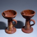 Earthenware grease lamps are rare in Canada. It is probable that these were made in the Niagara Region where they were found. The finely splattered dark and light brown glaze is seen on other Niagara earthenware. Grease is placed in the circular bowl or font and absorbed into a wick, which is held in place by a small tube. Both bowls are canted forward to keep the wick in the grease.