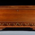 This blanket chest in the Niagara tradition features high bracket feet, mouldings above and beneath the drawers, reeded panels and cherry trim framing the drawers. Its large size is offset by the balanced proportions and attention to the decorative details. The original brass hardware has been replaced.