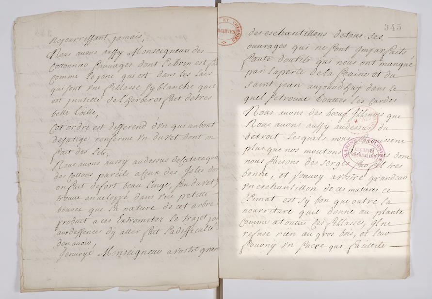 This letter was written by de Saint-Père to the Minister of Marine and Colonies of France in 1705. In it she describes her textile business and the different materials that she and her employees use. The region had a shortage of flax and hemp, and Agathe describes using materials found locally, such as nettles, bark, milkweed and bison wool, to make blankets. Although she does not mention them in her letter, it’s likely that she was inspired by local Indigenous peoples, who used these same materials.