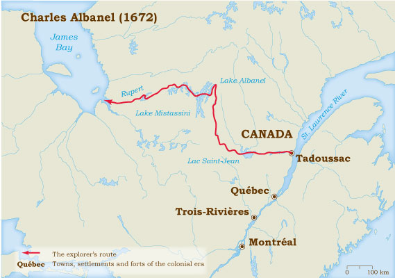 Just when and how did Charles Albanel come to the attention of the rulers of the colony? It is known that on the tenth of November, 1670, Jean Talon expressed his anxiety at the presence of “two English vessels overturned quite close to Hudson Bay” and the role that might have been played in their being there by “a certain Desgroseliers previously resident in Canada”. On the eleventh of November of the following year the Intendant wrote: “Three months ago I despatched Father Albanel, a Jesuit, and Monsieur de St. Simon, a young gentleman of Canada… they are to push forward as far as Hudson Bay, present written reports on all they discover, open up the fur trade with the savages, and above all reconnoitre to see whether there is cause to erect a few buildings for the winter there to make a storage from which ships might eventually be victualled if they should pass that way to discover the route between the two seas of the North and the South.”